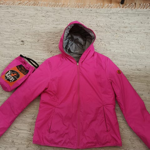 Huppu ja yksi takatasku, hupussa säätö, samoin kuin helmassa. Hihoissa joustoresori. Koko takki pakkautuu taskuunt tarvittaessa.
