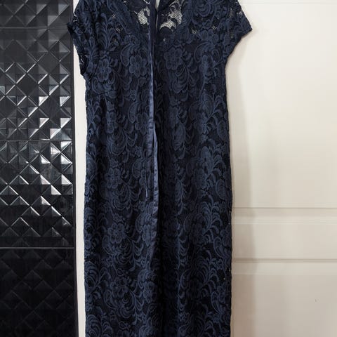 Myydään hyväkuntoinen äitiysjuhlamekko. Tummansininen väriltään. Olka-helmapituus noin 97cm ja kainalo-kainalo 56cm.