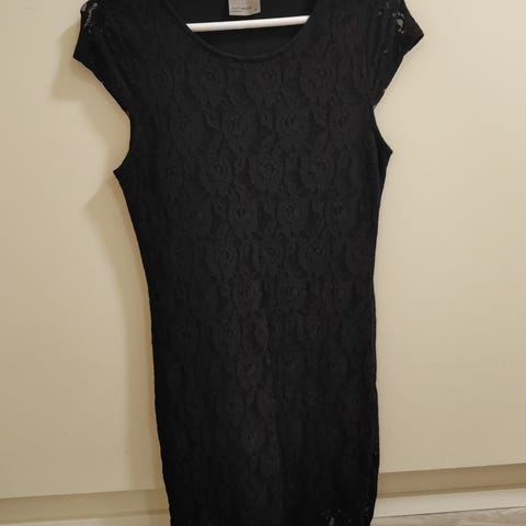 Myydään pitsinen mustan värinen juhlamekko. Hihat läpinäkyvää pitsiä. Kainalo-kainalo 51cm ja olka-helmapituus 99cm.