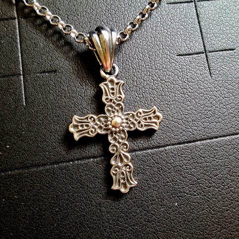 Lumoavan hopeinen aarre risti kaulakoru. Pituus ketjulla 45cm. Ristin koko noin 3,5cm. Sopii vaikka rippiristi. Jos ostat useamman korun laitathan viestiä ennen ostoa jotta voin lähettää korut yhdessä paketissa!
