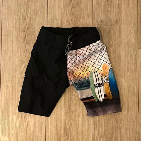 Molo uimashortsit 98/104, uudesta pohjaväri tummunut. Toisessa narunpäässä kulumaa ja muovi lähtenyt irti. Hyväkunto.