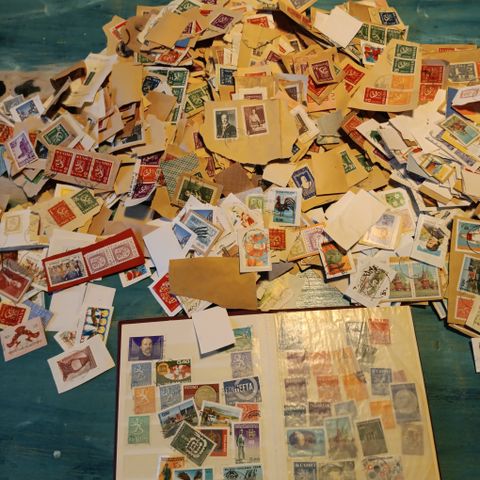 Iso kasa postimerkkejä. Laatikoissa ja kirjekuorissa.