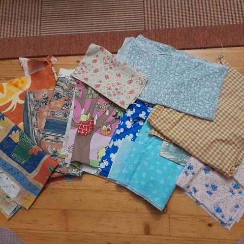 Vaaleanpunainen palan koko 70 x 115 cm, Vaaleansinisen palan koko 70 x 106cm. Lilan koko 45 x 132cm, tämä on leikattu vähän vinoon, mitattu kapeimmasta kohdasta. Uusia.