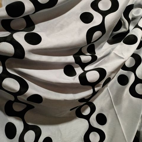Myydään harmaa-musta kirjainkuvioinen verhokangas. Kangasta on 11,5m. Kankaan leveys 1,40m.