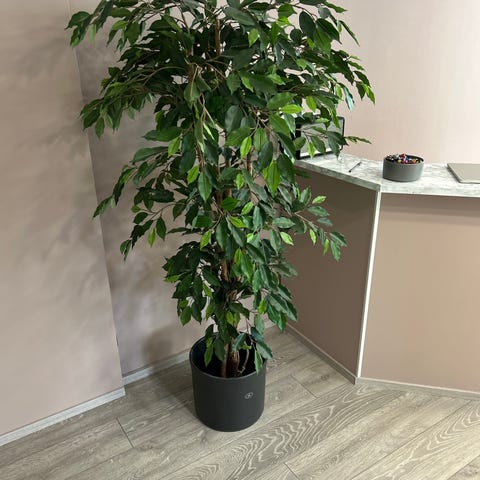 Iso kokoinen huonekasvi (Ficus Benjamina-puu). Sopii hyvin myös toimistotiloihin
