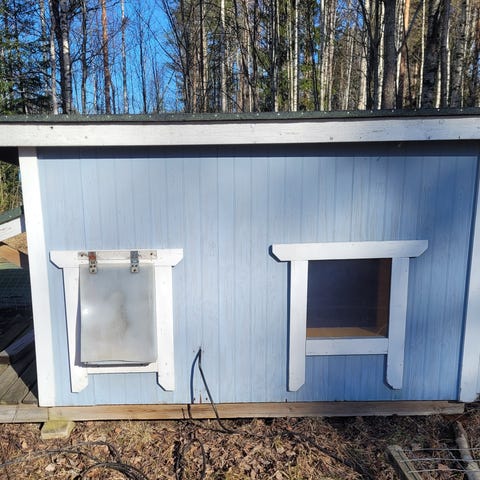 Kuvan mukainen lämmin eristetty koirankoppi ylimääräisenä myydään pois. pientä pinta käsittelyä tarvitsee. Hyvä peltikatto.