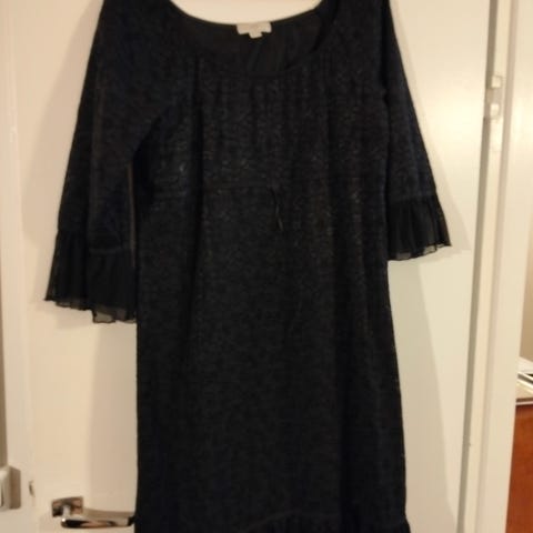 Vyötärö 45 cm (vyötäröllä kuminauha venyy 60 cm asti nätisti), olka-helma 145 cm.