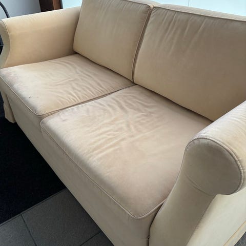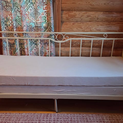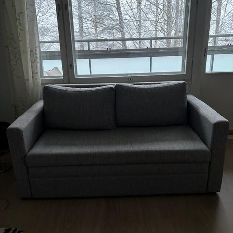 Kuvan levitettävä sohva, ollut autotallissa pölyyntymässä viimeiset 2vuotta joten tekstiilipesuria varmasti voisi näyttää tai ainakin imuria. Pienen pieni nirhauma toisessa käsinojassa, mukana petauspatja. Hyvä sohva vaikka mökille
