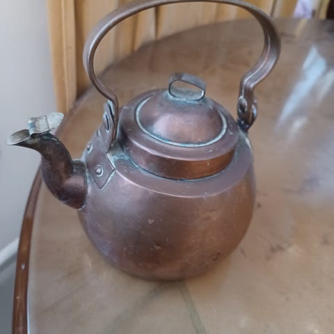 Kuparipannu, jossa on kantokahva ja kansi. Korkea, pyöreä muotoilu, käytetyssä kunnossa, pinnassa näkyvää patinaa ja kulumaa.