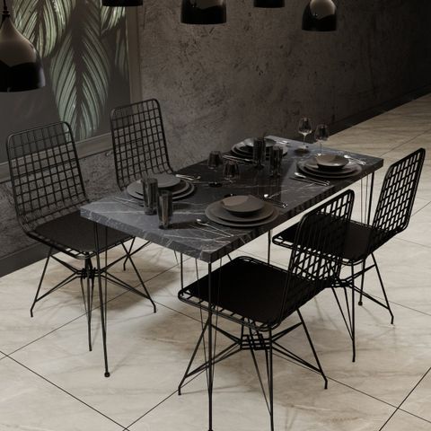Elegantti, ilmava metallirunkoinen ruokailuryhmä neljällä tuolilla. Materiaalien ja sävyjen kontrasti luo omaa tunnelmaa ja tekee setistä mielenkiintoisen kokonaisuuden monenlaiseen sisustukseen.