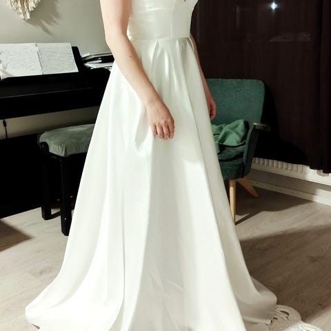 Myydään superihana häämekko, jossa pientä kiiltoa pinnassa. Koko ollut alunperin 38, pienennetty kokoon 34/36. Koon verran pystyy suurentamaan takaisin. Minun ry noin 86cm, vyötärö 70cm ja lantio 89cm. Pituus 154cm plus jalassa oli Parikan Jodelit, joista löysin tiedon, että korko olisi 8cm. Helmassa sisäpuolelle likaa, ulkopuolelta näyttää puhtaalta. Ei pesetetty. Voin postittaa ja saa tulla sovittamaan.