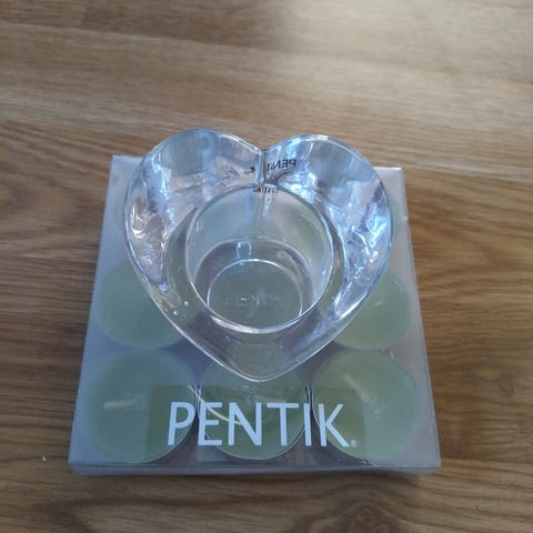 Pentik lasinen sydänastia ja pieni hyvin vaalean vihreä Pentik maljakko keramiikkaa.