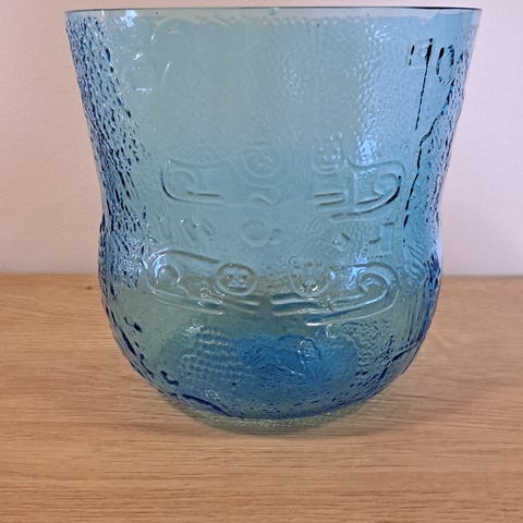 Sininen kuviollinen lasikulho, Nuutajärven valmistama, design Oiva Toikka