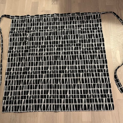 myydään tarpeettomana 2 kpl käyttämättömiä esiliinoja. Värikäs Finlaysonin 100% puuvillaa, käyttöönotto pesty. Säädettävä pujotus kaulan ympäri, pituus (173 cm pitkällä) polviin.