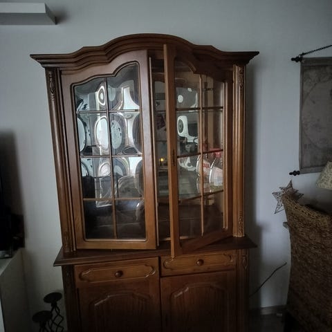 Myydään vitriinikaappi peilillä. Lakkapinta hieman repsottaa iän takia.Leveys 131 syvyys 47 korkeus 170