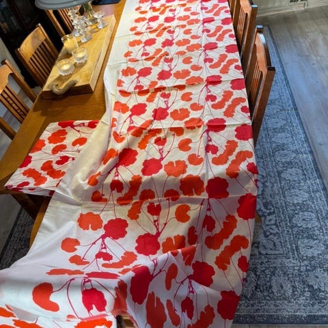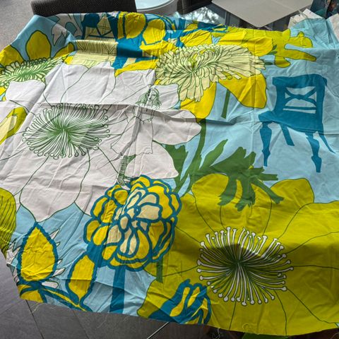 Marimekon Satula kuosinen kangaspala. Kankaan leveys 143 cm pituus toisesta reunasta 125 cm ja toinen reuna 135 cm. Pienen pieni reikä lähellä reunaa. Siksi hinta vain 9 euroa. Voin lähettää. Mmm.