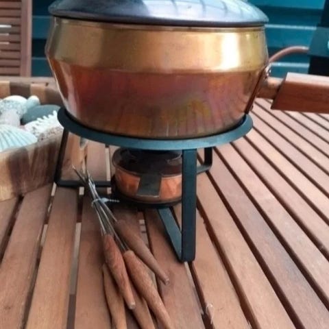 Fondue-setti, jossa valurautapata, 6 kippoa, 6 haarukkaa, 4 lusikkaa, poltin ja pyörivä puinen alusta. Käytetty vain muutamia kertoja.