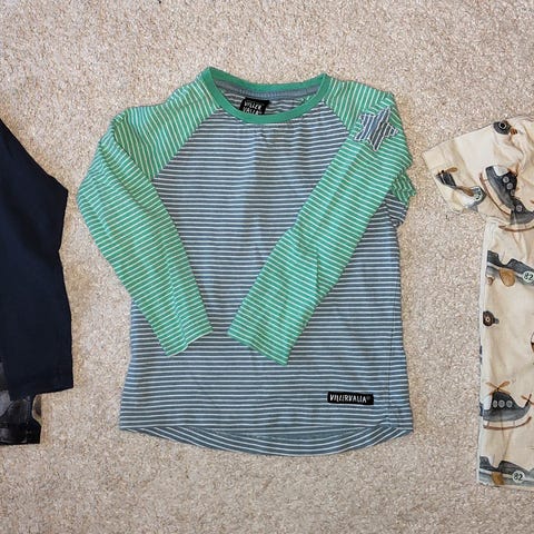 Myydään hyväkuntoinen vaatesetti, kaksi paljetti t-paitaa (toinen 98 ja toinen 104), pitkähihainen t-paita 98/104 ja kollaripaita vetskarilla koko 98.