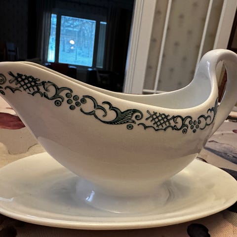 Kaksi Arabian tarjoilulautasta (koot 23x32cm ja 25x36cm) kastikekulho ja soppakulho kannella.