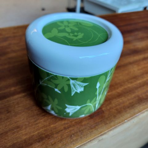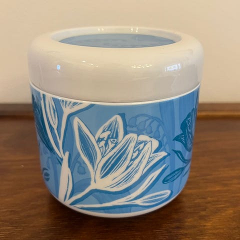 Arabian valmistama Heini Riitahuhdan suunnittelema, sininen Keto-säilytyspurkki vuodelta 2006. Sopii keittiön tai kylpyhuoneen kaunistukseksi.