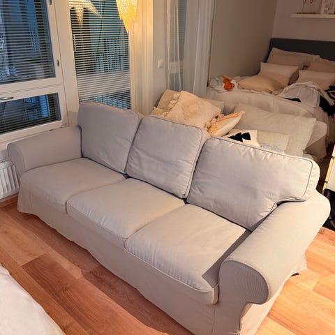 Ikean Ektorp-sohva ja samaan sarjaan kuuluva rahi.
