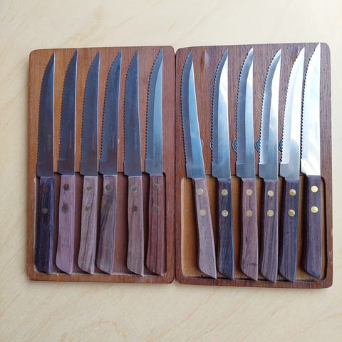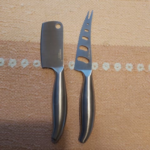 Veitsisetti erilaisille juustoille, 4 erilaista. Puinen säilytyskotelo.