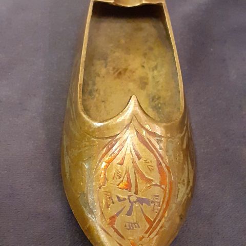 Komeasti lasikivin koristeltu messinkinen, tohvelin muotoinen tuhkakuppi / savukkeenpidin Turkista. Pituus 14 cm.