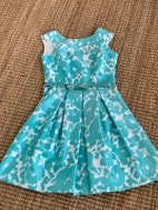 Kaunis nuoren juhlamekko. Näyttävä pääntie, joka on laskettu takaa hieman alemmas. Koko arviolta S. Vyötärön leveys 35 cm ja pituus olalta 85 cm. Mukan irrallinen kapea vyö. Väri merenvihreä. Kankaan pinnassa hieman kiiltoa.