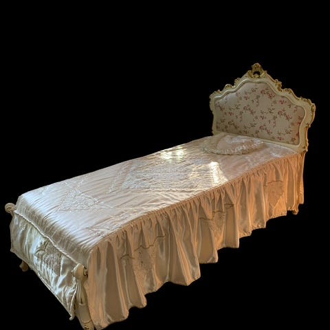 Viktoriaaninen rautasänky Ranskasta 1800-luvulta. Ensimmäisessä kuvassa siis myytävä sänky. toisessa ja kolmannessa kuvassa lähes identtinen sänky eri värisenä. Tuo myytävä on siis alkuperäinen vaaleanvihreä, mutta hyvin patinoitunut, mutta vihreä sävy tulee kuitenkin esille. Menee siis täysin litteäksi kuljetusta ja säilytystä varten. Mukaan saa halutessaan sohvaan ihanasti sopivan paksun vintage jousipatjan vihreällä kuvioidulla satiinipäällisellä.