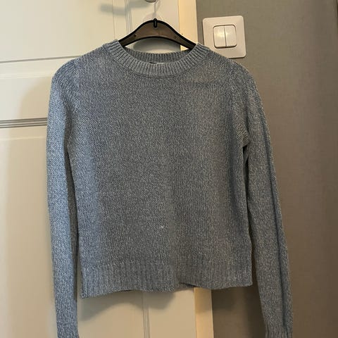 Harmaa valko violetti neule. Selkäpuolella napit. Fransa