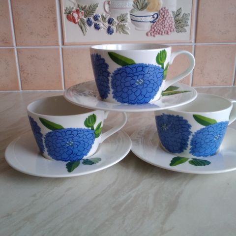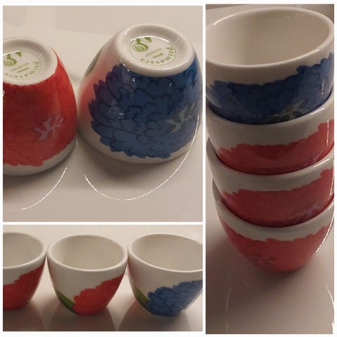 Väri on Suomen sininen. Mukaan kuuluu alkuperäinen pakkaus, se on ehjä, mutta vähän kärsinyt. Munakupit ovat ehjät ja hyväkuntoiset.