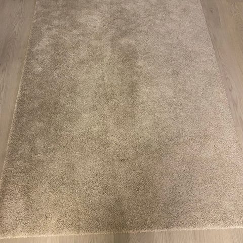 Vaaleanpunainen salmiakkikuvioinen kudottu matto. Väri paikoitellen haalistunut. Myynnissä myös toinen samanlainen, mutta pienempi.