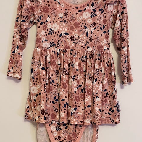 Myydään siisti Mingnelin pehmeä trikoinen bodymekko kukkakuosilla. Takaosassa on painonappi, joka helpottaa mekon pukemista. Yhdellä lapsella käytetty. 80