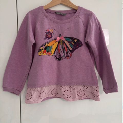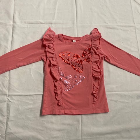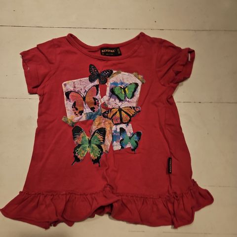 Paljon käytetty, mutta edelleen hyväkuntoinen valkoinen t-paita jossa värikkäitä perhosia ja kultainen glitter teksti Hello Happy Days. Kokomerkintä 110/116.