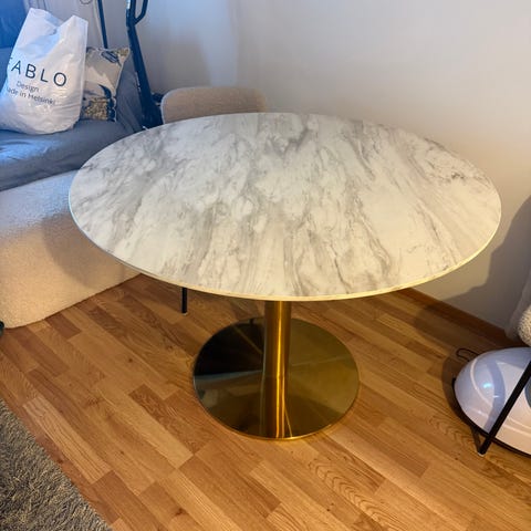 Uuden pöydän tieltä myyntiin upea, pyöreä ruokapöytä marmorikannella. Halkaisija 120 cm. Pöydän kansi on painava (arviolta n. 90 kg), joten noutoon tarvitaan kaksi kantajaa.
