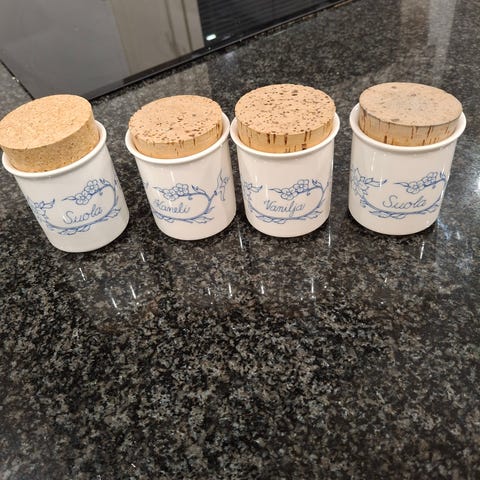 Arabia Meirami maustepurkki 80-luvulta. Suunnittelija Veikko Roininen. Korkeus ilman korkkikantta 7,5 cm, halkaisija 6 cm. Moitteeton kunto.