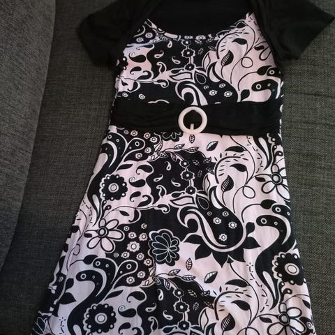 Punainen joustava kukkamekko jossa smokkirypytetty yläosa ja off shoulder pääntie. Halkio (pitkä) edessä vasemman jalan kohdalla. Koko 34 mutta joustaa isommallekin. Merkki Amisu.