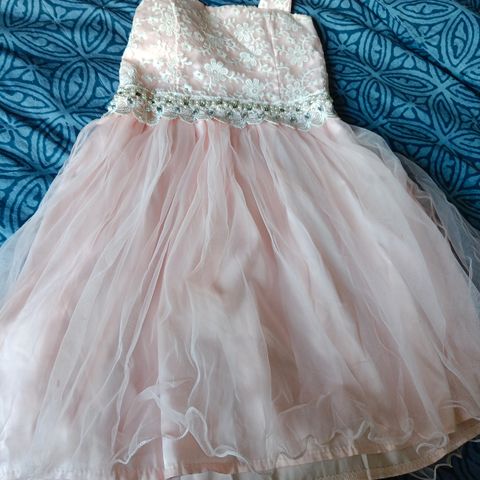 Nätti hyväkuntoinen mekko. Helmassa tyllikoriste. Vuori. Koristenauhat ommeltu kiinni, takana vetoketju. Päällinen Puuvillaa.