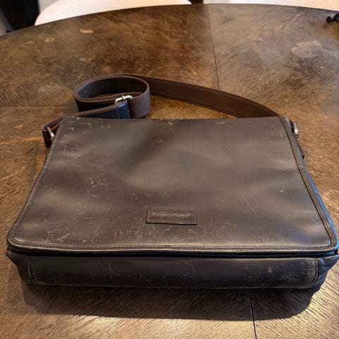 Musta nahkainen kansio / salkku, jossa voi kuljettaa dokumentteja, läppärin tai muuta vastaavaa. Laukku on noin A4 kokoinen. Laukulla on iroitettava olkahihna ja erillinen käsikahva. Laukku sulkeutuu vetoketjulla. Sisällä on pieniä taskuja. Merkki: Buxton.