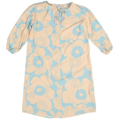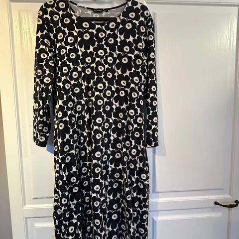 Marimekon Aretta Pieni Unikko trikoomekko. A linjainen ja taskullinen. Väritys pohja beige, kukat tummansininen, keskus valkoinen ja musta. Materiaali 100% puuvillaa.