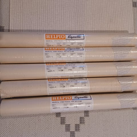 Kaksi rullaa limääräiseksi jäänyttä kaunista Gysingen paperitapettia “ Hullebo”, sävy roosa, joka on nimestään huolimatta vaalea tiilenpunainen. Yksi avaamaton rulla. Todella kaunis tapetti seinässä, hyvin vastaava kuin Pihlgren& Ritola-tapetit