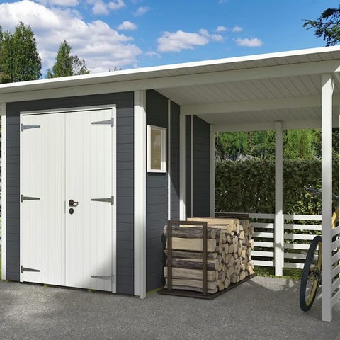 Goodiy-pihavarastossa on harjakatto sekä leveästi aukeavat pariovet, joista tavarat ja koneet mahtuvat hyvin. Pieni lasinen sivuikkuna antaa valoa. Ikkunallisen seinän paikan voi kokoamisvaiheessa valita vapaasti.