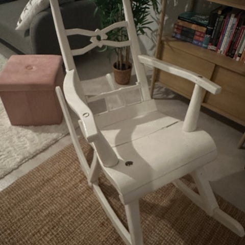 Valkoinen maalattu keinutuoli. Muuten hyvä, tarvitsee vain uuden maalipinnan. Harmaa istuin pehmuste mukana.
