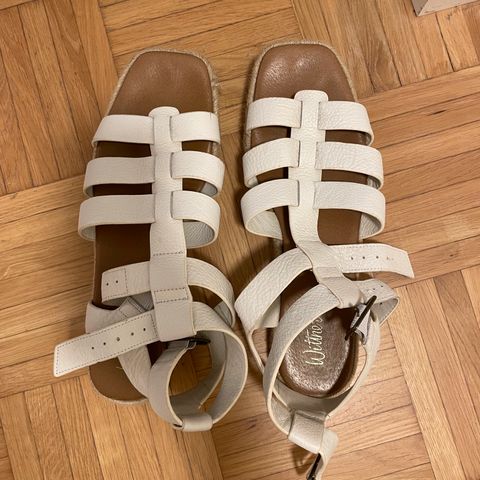 Kivat beigenväriset nahkasandaalit koossa 41. Puinen korko. Käytön jälki edessä (värjäymä, ei iske silmään, katso kuva), muuten siistissä kunnossa.