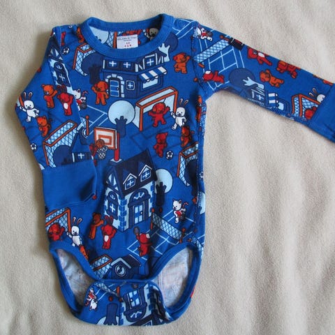 Short sleeved body-wrap from PoP in excellent condition apart from a small stain on the back (pic 2). Has got two rows of clips in the crotch so grows with the baby. Non scented.