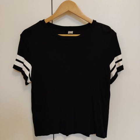 Myydään erittäin hyväkuntoinen musta t-paita. Väri on musta, vaikka näyttää kahdessa ensimmäisessä kuvassa harmaalta. Kolmas kuva vastaa todellista väriä. Paidassa leveämpi kaula-aukko sekä pieni tasku.