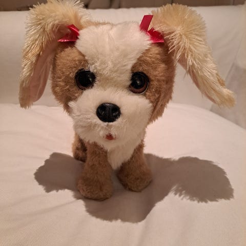 Paristoilla toimiva ja toimivaksi testattu ääntelevä koira. Koiran rintaan muodostuu myös vaaleanpunainen valosydän kun se on iloinen.