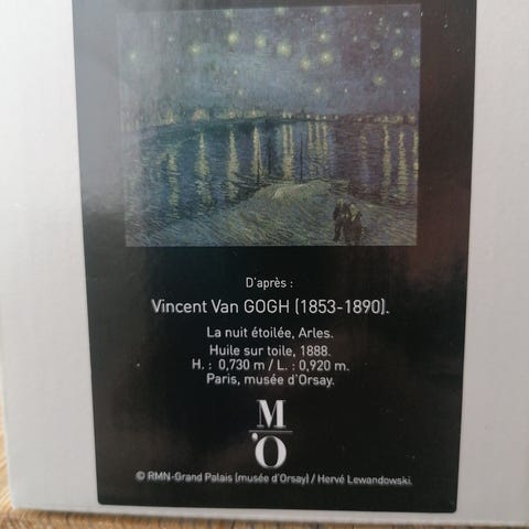Pieni ( 5.5 cm) keraaminen mukki, jota ympäröi Van Goghin vehnäpelto ja variksia- maalauksen kuva.