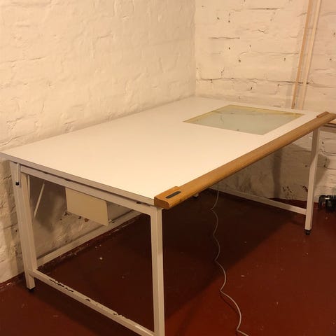 Perinteinen latomon / kirjapainon valopöytä maitolasilla ja loisteputkilla.