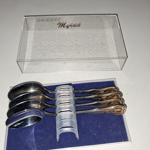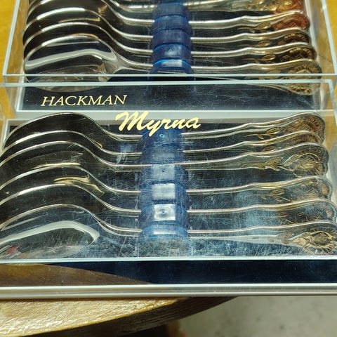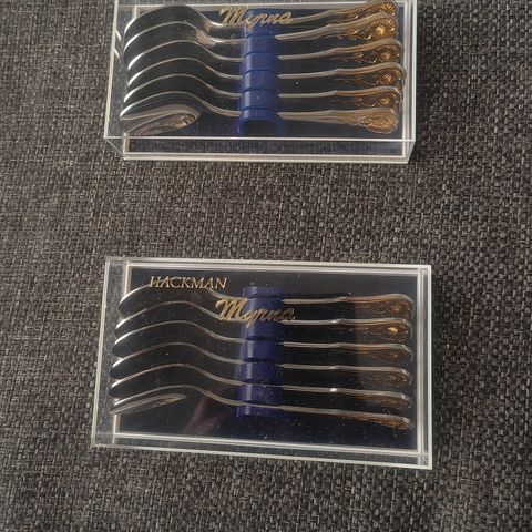 Erittäin hyväkuntoiset, kaksi kertaa käytetyt Hackmanin Myrna-pikkulusikat alkuperäisissä laatikoissaan. Tarjolla on kaksi kuuden kappaleen laatikkoa. Hinta 50 euroa / laatikko.